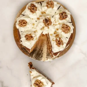 Nuestra carrot cake tiene un bizcocho muy jugoso con un toque de especias y está relleno de crema de queso.