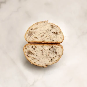 Es un pan de miga de consistencia media pero saciante debido a la harina integral de trigo. Lo elaboramos con masa madre natural de cultivo propio por ello tiene un sabor láctico y lo horneamos en nuestro horno de suela de piedra, lo que mejora su larga conservación.